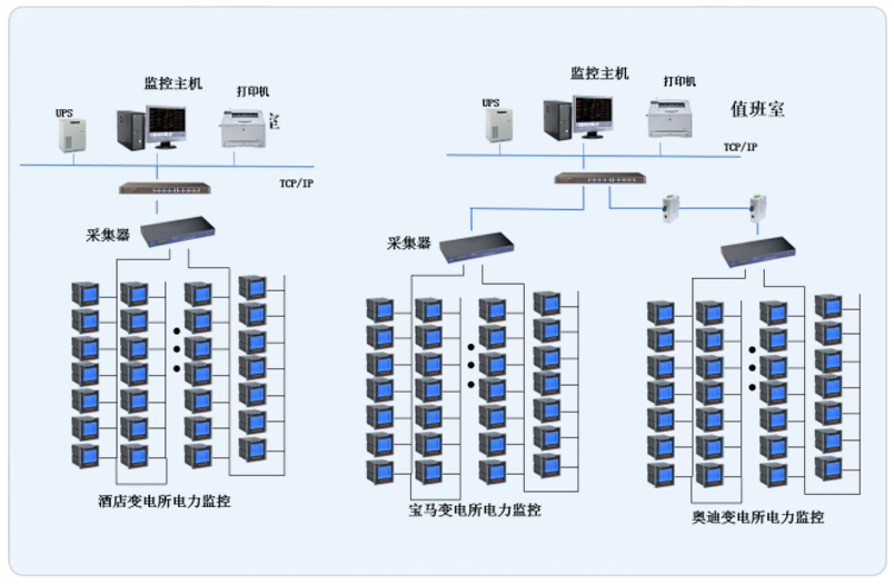 本項(xiàng)目共有176個(gè)PZ80L-E4/KC、14個(gè)PZ96L-E4/KC多功能電力儀表。值班室位于1#樓配電室旁,放置一臺(tái)Nport5630-16串口服務(wù)器。場(chǎng)儀表經(jīng)485總線連接值串口服務(wù)器的任務(wù),串口服務(wù)器由現(xiàn)場(chǎng)的以太網(wǎng)絡(luò)將數(shù)據(jù)傳輸至監(jiān)控主機(jī)上。本監(jiān)控系統(tǒng)采用分層分布式結(jié)構(gòu),即站控層,通訊層與間隔層。